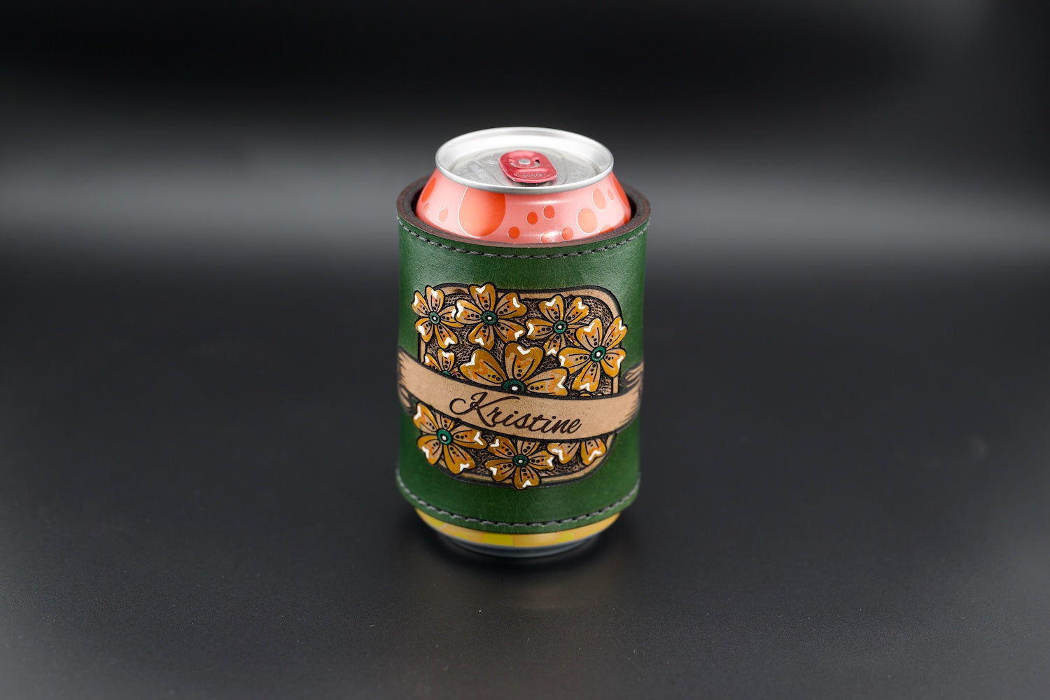 Hand-painted leather beverage holder designed to fit standard 12-ounce cans and bottles. Choose from six vibrant colors, each featuring unique character and authentic leather imperfections that develop a rich patina over time. The durable construction keeps drinks at the right temperature while adding rustic style to any occasion, from picnics to home gatherings.